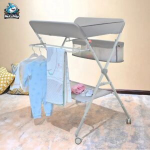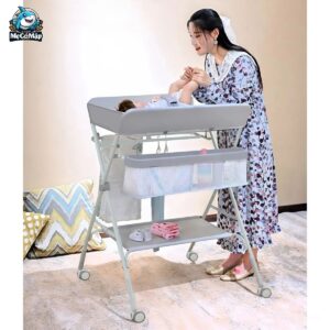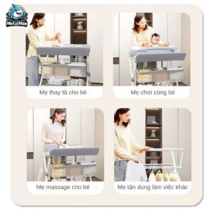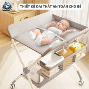 – Bàn thay tã được trang bị nhiều vị trí để đồ tiện lợi như thanh treo đồ, giỏ đựng đồ 3 ngăn, 1 tầng để đồ phía dưới,…