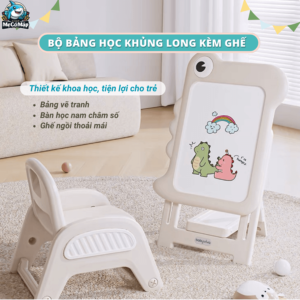 – Bộ bảng vẽ khủng long và ghế ngồi với 2 gam màu chủ đạo trắng – xanh nhạt. Đây đều là những gam màu tươi sáng, phù hợp với lứa tuổi của các bé.