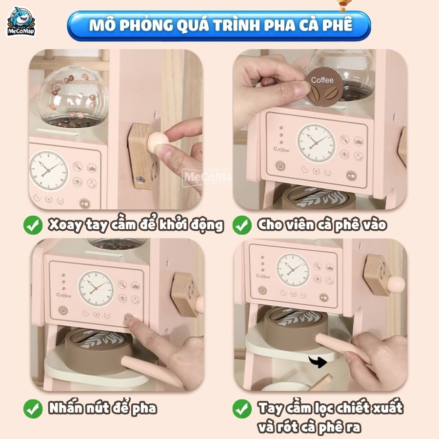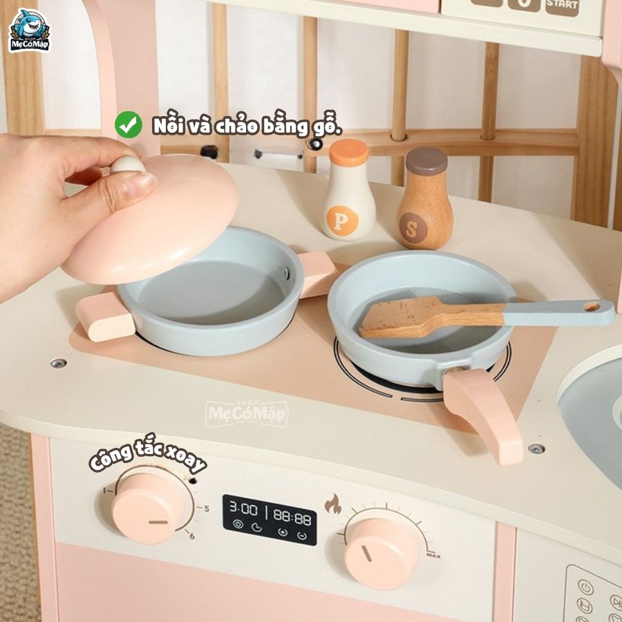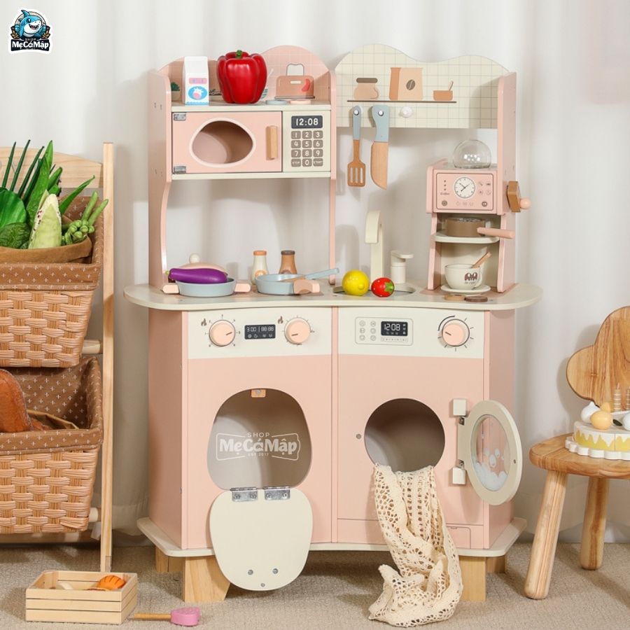 Bộ đồ chơi nấu ăn cho bé gái DCB01 màu hồng được thiết kế mô phỏng một căn bếp hiện đại thu nhỏ, đầy đủ các thiết bị quen thuộc như bếp từ, lò nướng, máy pha cà phê và dụng cụ nấu ăn. Sản phẩm làm từ 100% gỗ tự nhiên, bề mặt nhẵn mịn, an toàn cho bé khi vui chơi mỗi ngày.