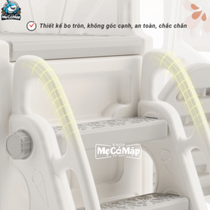 Máng trượt được thiết kế với chiều dài 160cm, rộng 38cm và thành máng trượt cao 19cm. Điều này đảm bảo rằng khi trượt bé hoàn toàn được thoải mái và an toàn. Ngoài ra, cầu thang lên xuống cũng được thiết kế khép kín, thành vịn cao và bo cong, nhẵn mịn, chắc chắn. Trên mặt các bậc thang có họa tiết dập nổi chống trơn trượt hiệu quả.