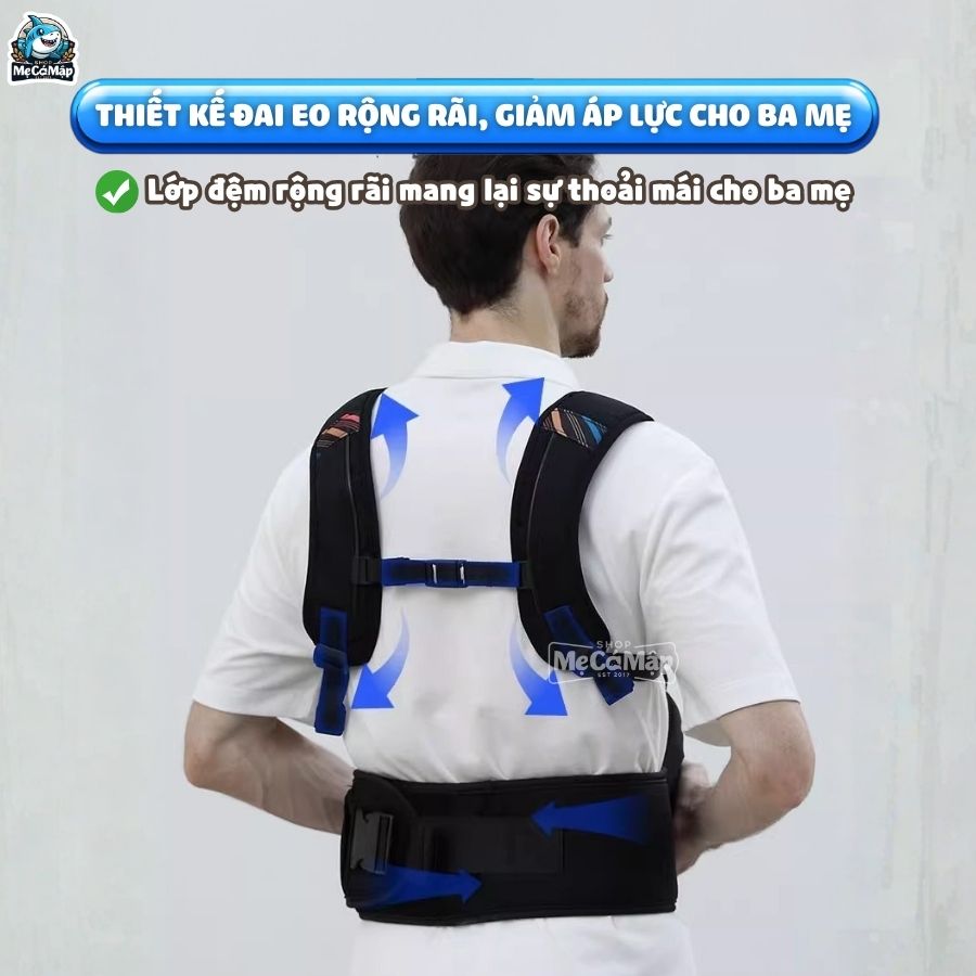 – Quai địu bản rộng 7,7 cm, điều chỉnh 35–54 cm, phân bổ đều trọng lượng giúp ba mẹ đỡ mỏi vai – lưng.