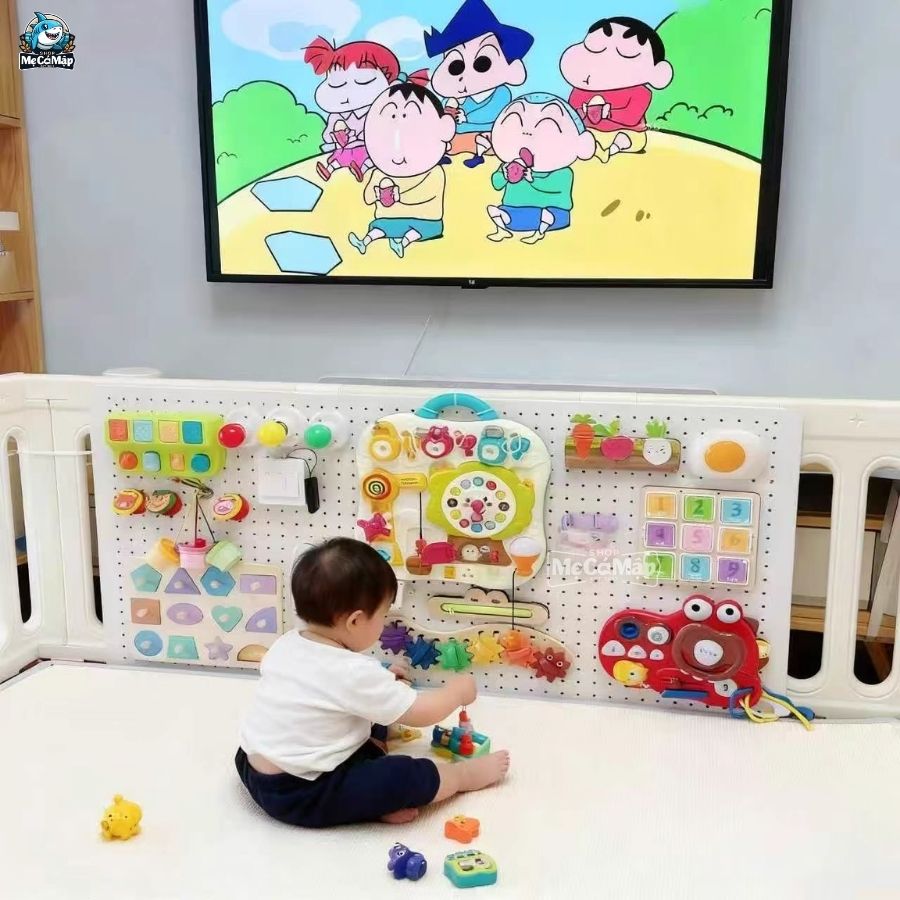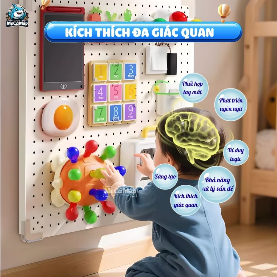 Bảng bận rộn giúp bé rèn luyện kỹ năng vận động tinh nền tảng quan trọng nhất cho sự phát triển của trẻ. Các đồ chơi bao gồm hoạt động cầm, nắm, vặn, kéo, đẩy… giúp đôi tay trở nên khéo léo, cả tay phải lẫn tay trái, đồng thời kích thích sự phát triển đồng đều của não bộ hai bán cầu. Bộ phụ kiện bao gồm: