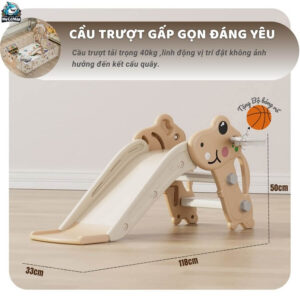 - Cầu trượt có kích thước 118x50x30, hình khủng long, bậc thang không khép kín, kèm vòng bóng rổ nhỏ trên cầu trượt