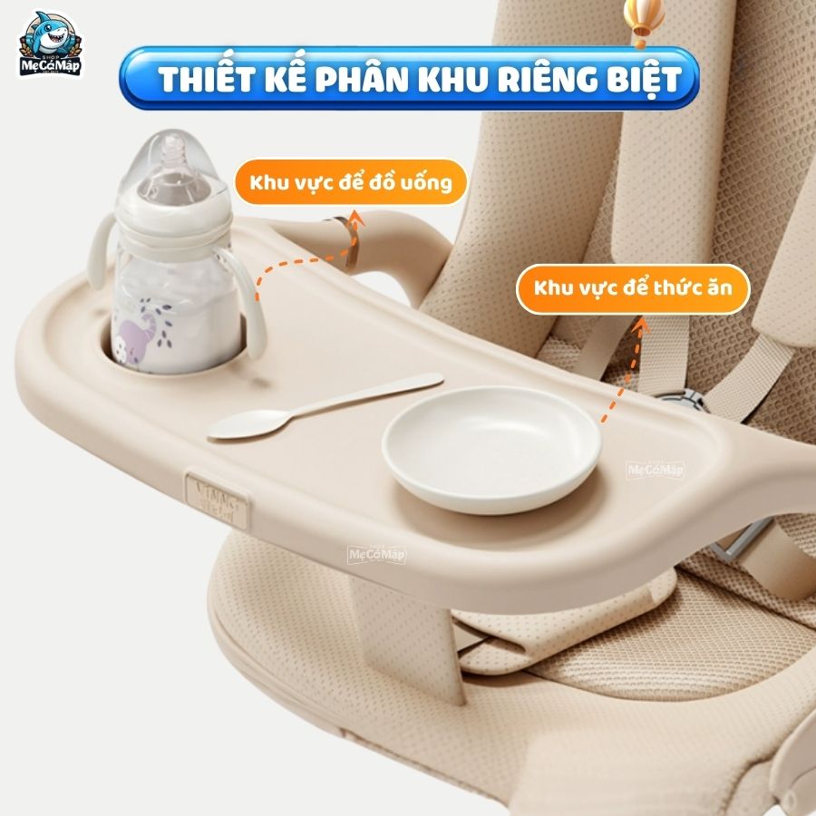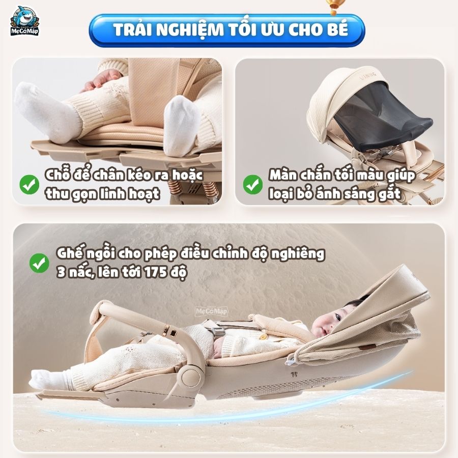 - Ghế ngồi công thái học hình chữ U xoay 360 độ, cho phép điều chỉnh độ nghiêng 3 nấc, lên tới 175 độ, giúp ba mẹ có thể dễ dàng thay đổi tư thế ngồi, ngả, nằm phù hợp cho bé.